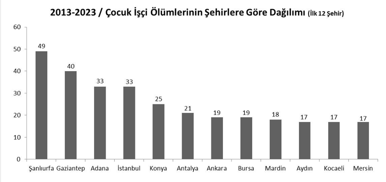 İSİG verilerine göre 2013-2023 arasında Türkiye’nin 77 şehrinde 49 çocuk Şanlıurfa’da, 40’ı Gaziantep’te, 33’er çocuk Adana ve İstanbul’da iş cinayetlerinde hayatını kaybetti. En fazla ölüm, mevsimlik çocuk işçiliğinin yoğun olduğu Şanlıurfa’da yaşandı.