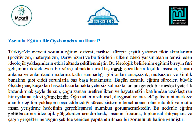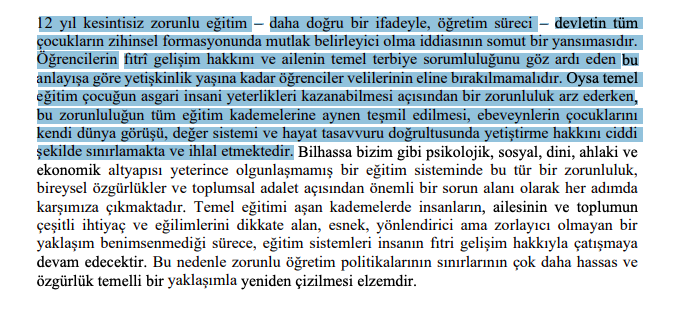 “Zorunlu eğitim, öğrencilerin fıtrî gelişim hakkını ve ailenin terbiye sorumluluğunu göz ardı etmektedir. Bu sistem ebeveynlerin çocuklarını kendi dünya görüşü, değerleri, hayat tasavvuru doğrultusunda yetiştirme hakkını ciddi şekilde sınırlamaktadır.”