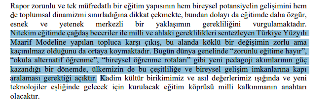 Raporda ayrıca, Türkiye’deki zorunlu eğitim sisteminin “pozitivizm, materyalizm ve Darwinizm gibi yabancı fikir akımlarının etkisi altında şekillendiği” iddia edildi. “Dünya genelinde ‘zorunlu eğitime hayır’ gibi yeni pedagoji akımlarının güç kazandığı” öne sürülerek, Türkiye’nin de bu çeşitliliğe kapı aralaması gerektiği savunuldu.